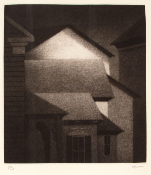Robert Kipniss (1931) is a painter and printmaker from New York whose work – usually lithographs and mezzotints – typically depicts trees, houses, and still lifes set against landscapes with a characteristic sense of solitude. Kipniss was born into an artistic family – both of his parents were commercial illustrators. At age sixteen, Kipniss began attending the New York’s Art Students League on Saturdays. In 1954, he earned his BA and his MFA in English literature from the University of Iowa. He was then drafted into the US army for two years, where he drew training aids. After his discharge, he painted during the day while working at the Manhattan General Post Office in the evenings until 1964. Kipniss has received commendations including two honorary doctorates and the Benjamin Clinedest Memorial Medal for lifetime achievement in art (2010). His work is held in collections such as the Art Students League in New York; the Carnegie Museum of Art, Pennsylvania; and the Museum of Fine Arts, Boston.