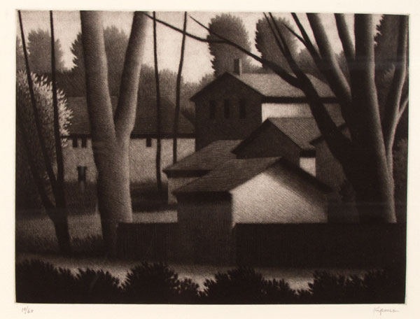 Robert Kipniss (1931) is a painter and printmaker from New York whose work – usually lithographs and mezzotints – typically depicts trees, houses, and still lifes set against landscapes with a characteristic sense of solitude. Kipniss was born into an artistic family – both of his parents were commercial illustrators. At age sixteen, Kipniss began attending the New York’s Art Students League on Saturdays. In 1954, he earned his BA and his MFA in English literature from the University of Iowa. He was then drafted into the US army for two years, where he drew training aids. After his discharge, he painted during the day while working at the Manhattan General Post Office in the evenings until 1964. Kipniss has received commendations including two honorary doctorates and the Benjamin Clinedest Memorial Medal for lifetime achievement in art (2010). His work is held in collections such as the Art Students League in New York; the Carnegie Museum of Art, Pennsylvania; and the Museum of Fine Arts, Boston.