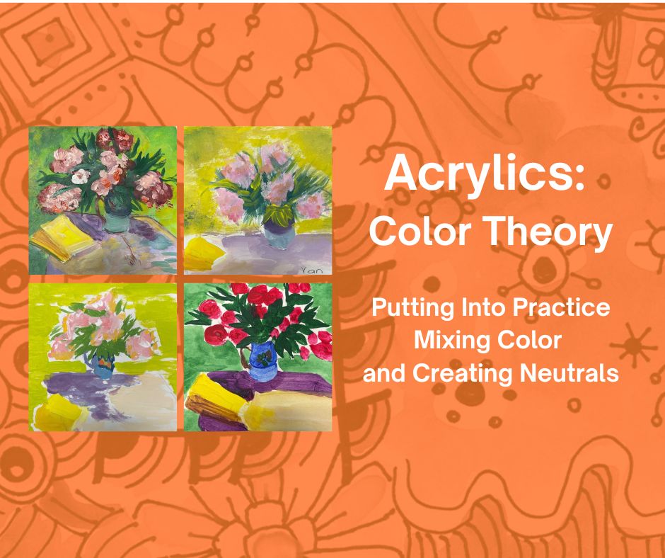 Discover the versatility of acrylic paint in this relaxed, hands-on workshop. We’ll explore how artists use color, layering, and texture to bring their ideas to life. The first week we begin with the foundations—mixing colors, creating harmonious palettes, and learning how transparent and opaque layers can transform a painting. Through simple guided exercises, you’ll practice building color step by step to create depth, mood, and richness.